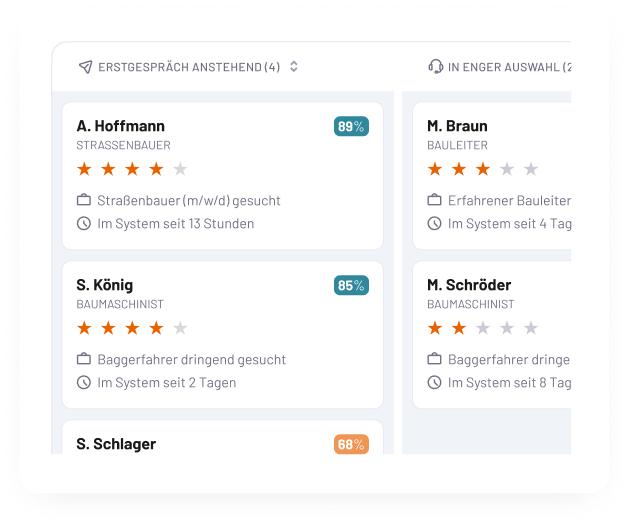 Nicht nur der Eingang von Bewerbungen wird digitalisiert, sondern der gesamte Weg dahinter sauber geführt: von klareren Stellenprofilen über strukturierte Kandidatenwege bis hin zu fachlich besser aufbereiteten Entscheidungsgrundlagen. 100% bauspezifisch.